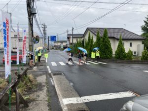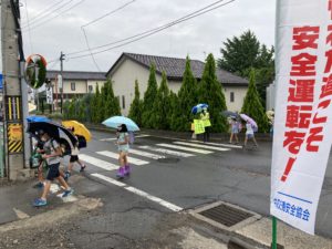 夏の交通安全やまびこ運動中、東吉田支部は通学する児童に対して「交通事故にあわな