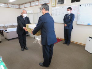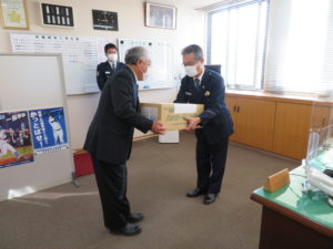 (貼るカイロ)を髙松剛中野警察署長にお渡ししました。「寒さに負けず交通指導取締