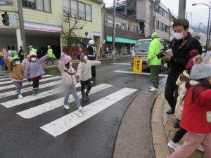 横断歩道の渡り方や信号機がある交差点の渡り方を体験しました。