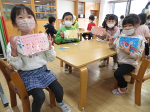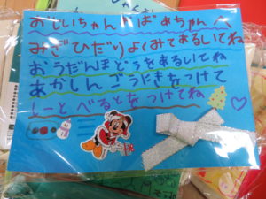 園児の祖父母宛に交通事故防止のメッセージカードを作成し、エコバッグに貼り