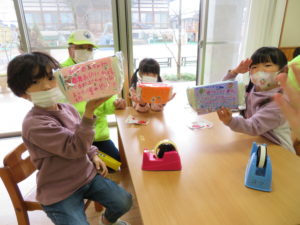 付けてのプレゼント作りも行いました。最後は、お楽しみの長野県警察のマスコ