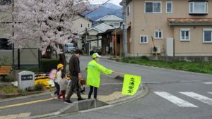 東吉田支部は「信州さくら満開こども交通安全週間」中に通学道路で保護誘導活動を行いました