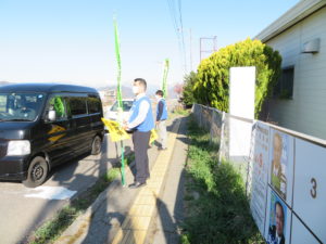 着用してのぼり旗を掲げながら、通勤する車両の運転手等に交通安全を呼びかけ