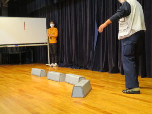 最後に、飲酒状態を体験できるゴーグルを着けた歩行体験を行い、