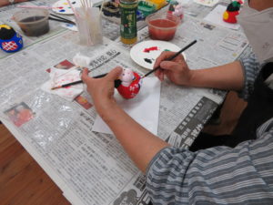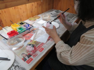 マスコットの中野創作土雛「お福さん」の絵付け作業を行いました。