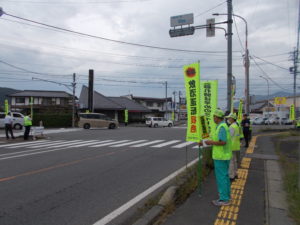 通勤者等にルール・マナーアップ、交差点事故注意、飲酒運転根絶等のぼり旗を掲げて