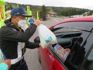 笑顔で「いただきます。活動頑張って下さい」「うれしい!志賀高原に来て