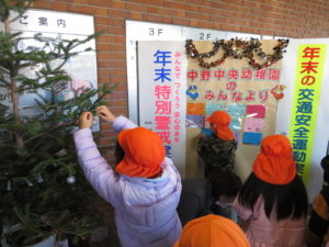 中野警察署に中央幼稚園児がクリスマスツリーを飾り付け