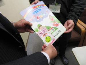 中野市教育長へ反射キーホルダー、小学1年生向け冊子(全16ページ)、