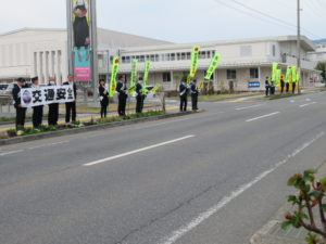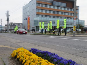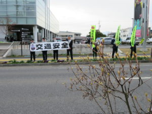 県道沿いにおいて交通事故防止を願い、人波作戦を行いました。