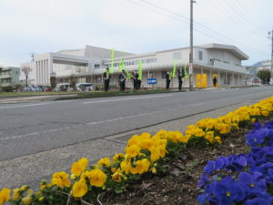 人波作戦では、色とりどりのパンジーが咲く中で団長、議長、署長、副議長が
