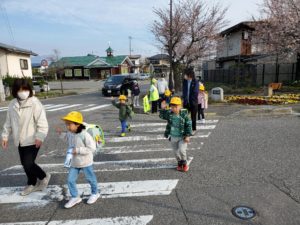 て渡ると教えられ、行ってきますと元気な姿で登校していきました。新入学児童
