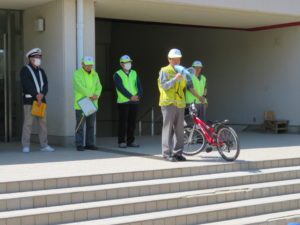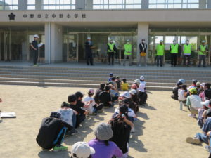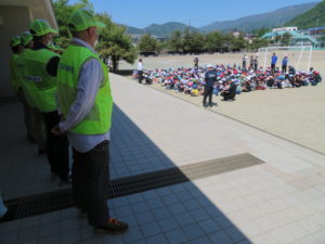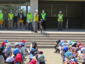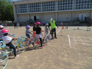 5月10日(金)午後、晴天の中で中野小学校の3年生、4年生に対する自転車の安全な乗り方を指導