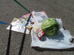 啓発活動は、交通事故防止チラシ、えのき茸、朝取りキャベツを袋に入れ、「秋の全国