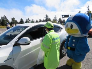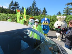 と声かけしながら啓発物を手渡しました。受け取った行楽客は、「うれしい、志賀高原