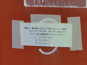 たいことや防災知識などを学びました。水入りのペットボトルに懐中電灯をかざすこと