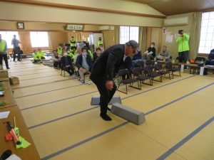飲酒状態を体験できるゴーグルを着用しての歩行体験(東吉田高齢者交通安全教室)