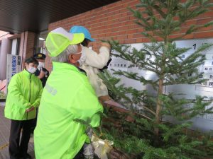 察署の玄関にクリスマスツリーの飾り付けとおじいちゃん、おばあちゃんへの交通