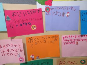 事故防止や詐欺被害防止の手作りのメッセージカードを貼りつけ被害防止を願いま