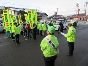 16日、年末の無事故を願い開設しました。出陣式の挨拶は、北信地域振興局副局長、
